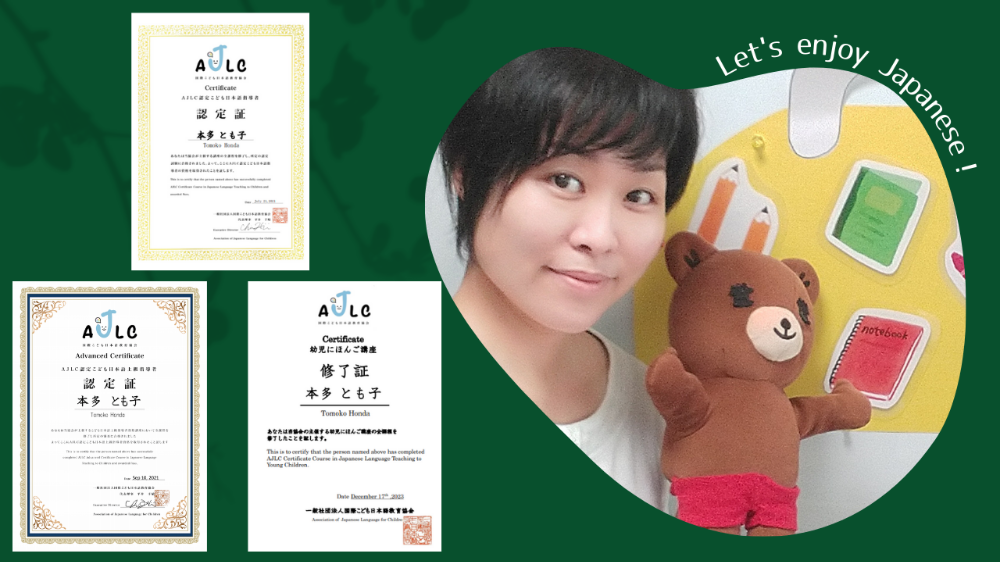 一般企業にて17年勤務。海外出張があったことをきっかけに語学の世界にのめり込む。自分の息子が少しずつ言葉を習得していく過程を間近で見て子供の言語学習に興味を持ち、“こども専門の日本語教師”の資格を取得。◆2020年 日本語教育能力検定試験 合格◆2021年 AJLC認定 こども日本語指導者資格 及び こども日本語上級指導者資格コース 合格◆2023年 AJLC主催 幼児にほんご講座(現 プレ国語講座)修了◇2025年 第二子出産。産休育休を経て2026年レッスン再開。